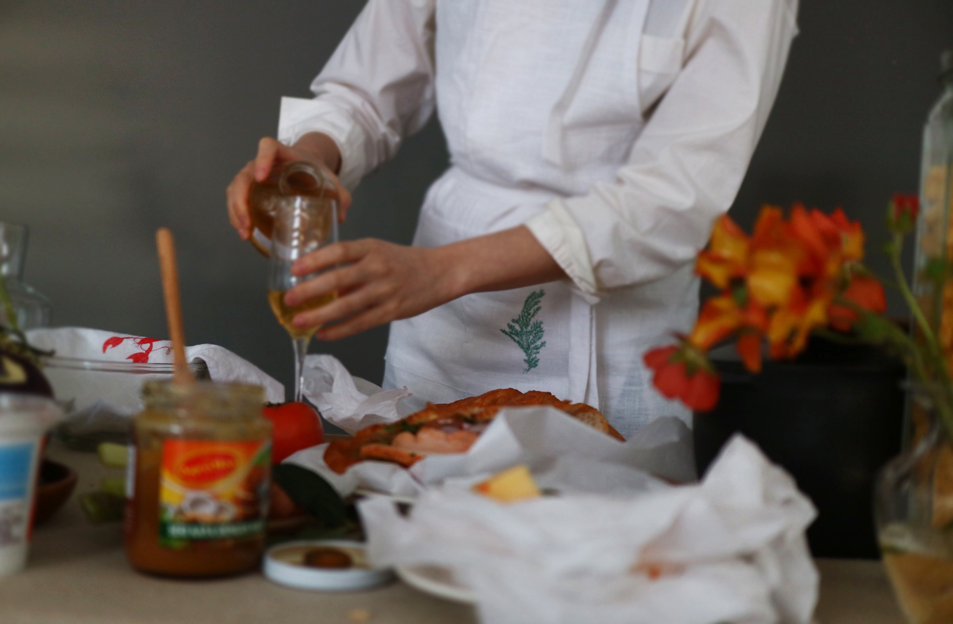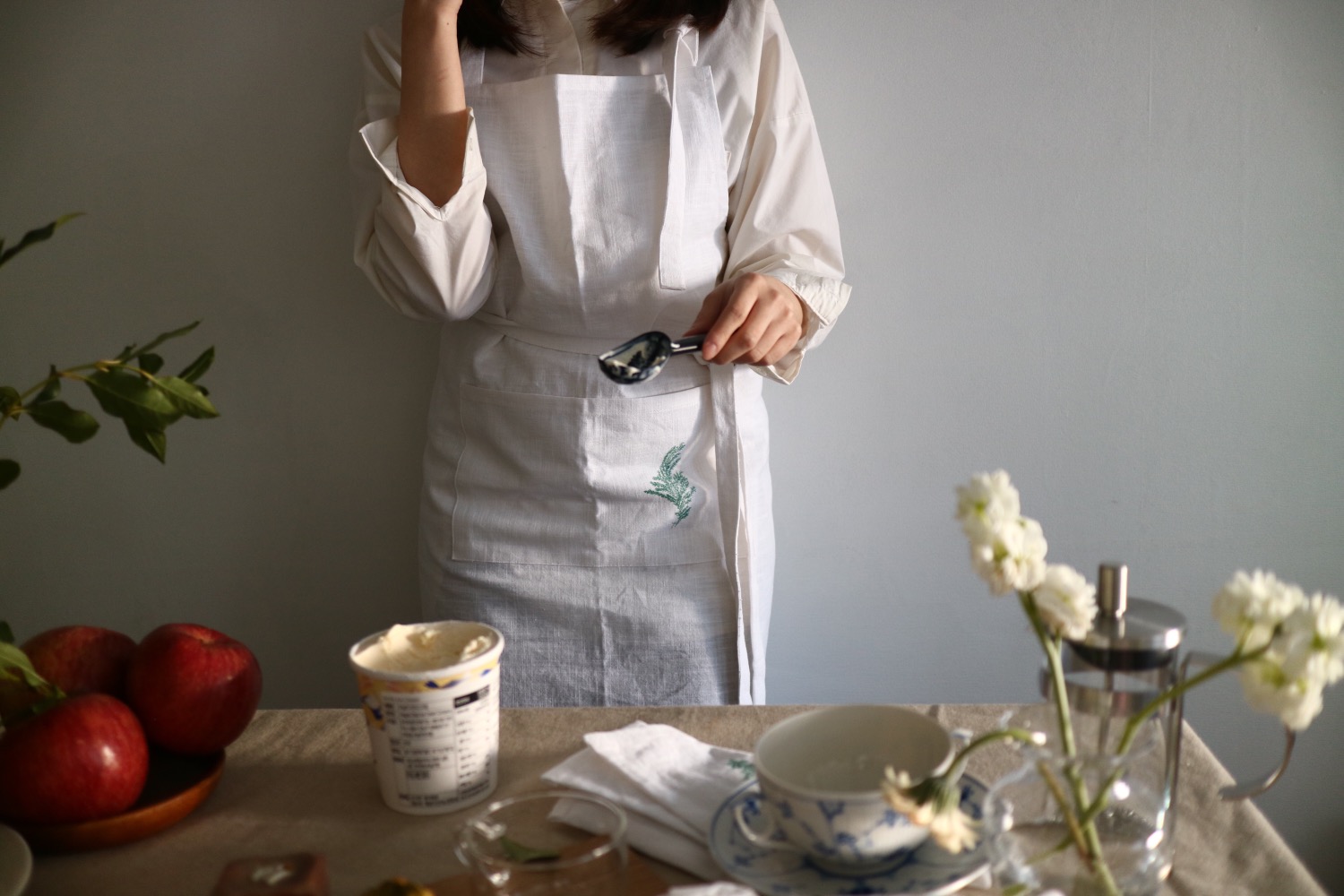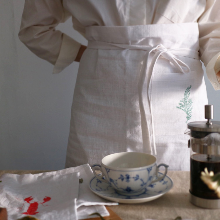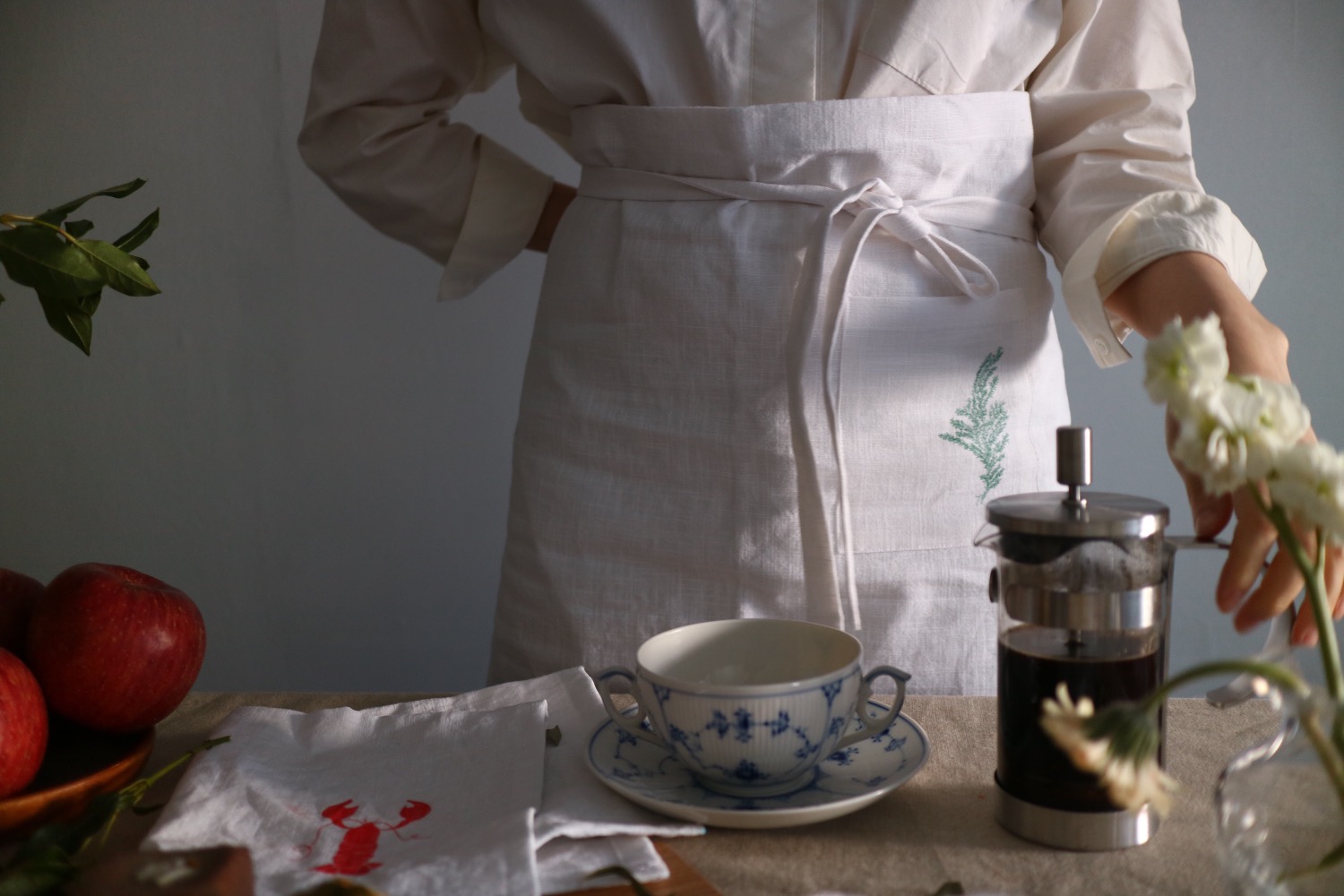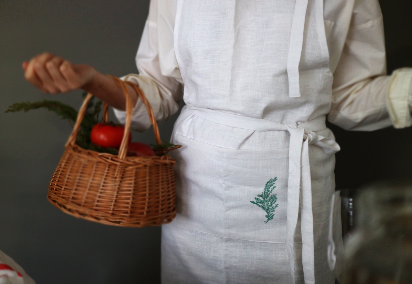 주머니 부분의 초록색 식물 프린트가 당신의 주방에 청량함을 가져다 줍니다.